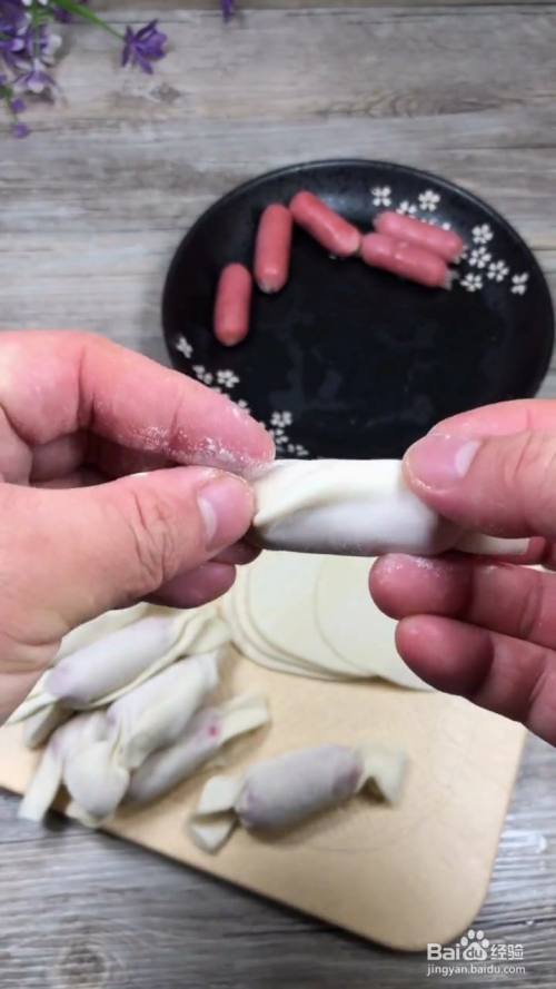 把火腿肠放在饺子中间,滚边,包好中间。再捏好角。如图。