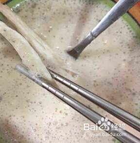 杏鲍菇条放入面糊中,均匀挂上一层面糊。