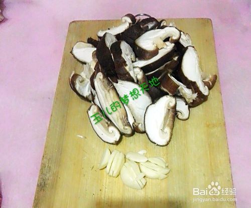 再把香菇切成片,大蒜籽用刀背拍一下去皮,也切成片备用。