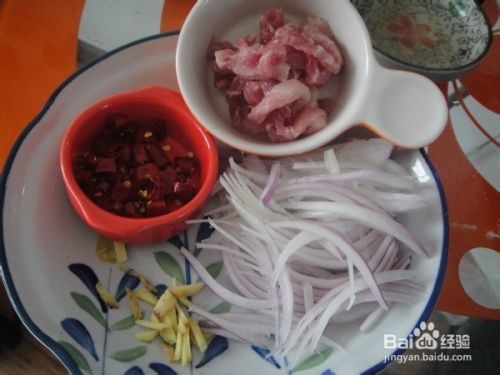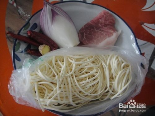 准备好食材:猪肉、洋葱、生面条、干辣椒、姜