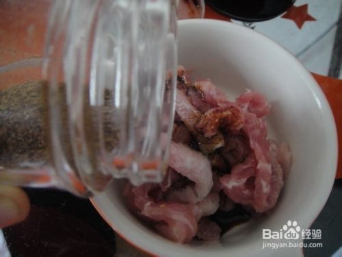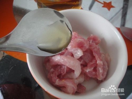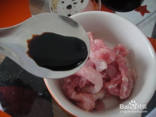 猪肉洗净切丝,猪肉丝加适量料酒、老抽
