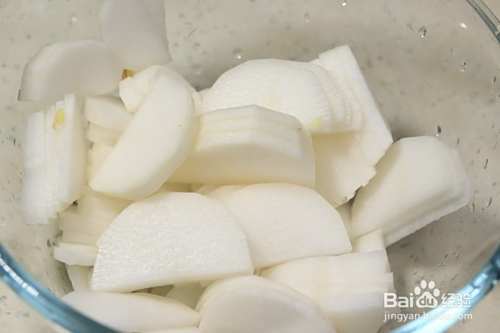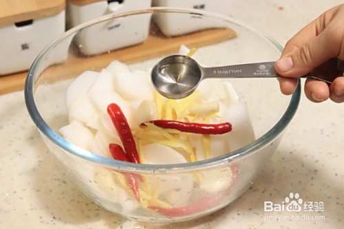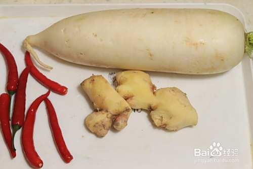 小米椒切断,姜切丝,大蒜切开放入白萝卜里。