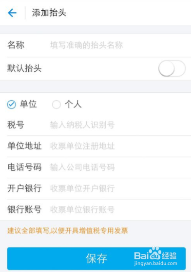 在“添加抬头”页面,输入新的发票抬头,点击“保存”,就可以添加成功了