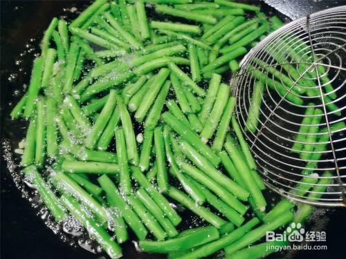 再把豆角放入锅,加少量盐和鸡粉,淀粉水翻炒均即可。