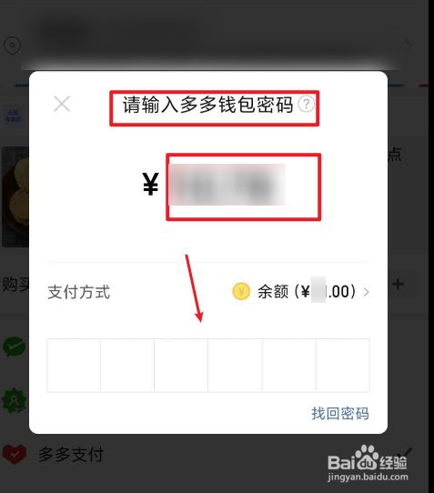 在多多钱包密码窗口中,可以看到多多钱包余额,输入支付密码,我们就可以支付成功。