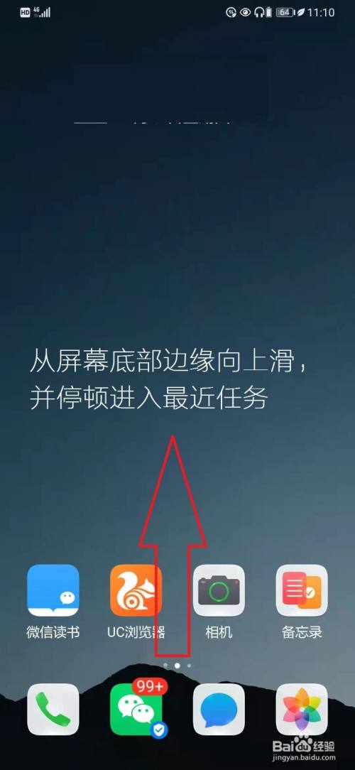 在华为手机桌面,向上滑动屏幕,进入最近任务管理页面。