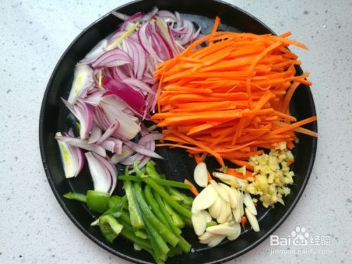 准备食材,胡萝卜洋葱青椒切成丝,再准备一些葱花姜末蒜片。