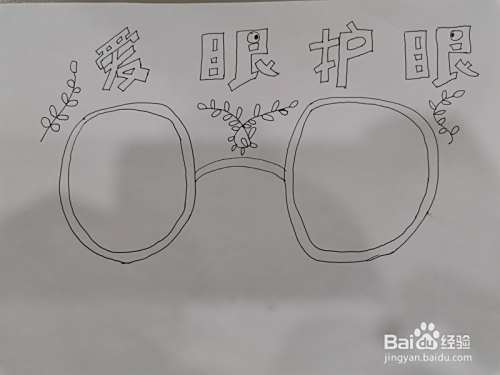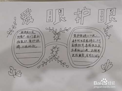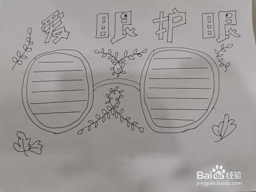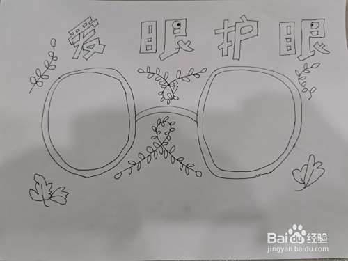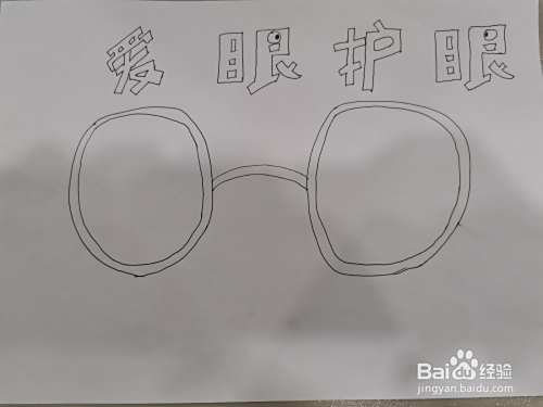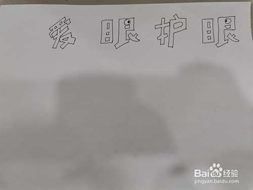 在白纸上方写上“爱眼护眼”四个大字,镂空字体,眼字的里面可以放上两个眼睛珠。