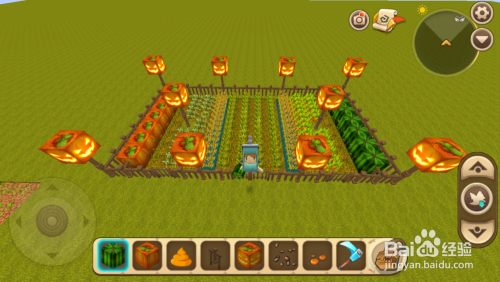 第六步,在围栏的每个角落加高一层围栏,在上面放上南瓜灯(其他的灯也可以,如果用的是石头围栏,还可以插火把),然后在农田里面也要放置两格高的围栏,再安上灯。这样能给植物提供光照,并且避免农田中刷出怪兽。