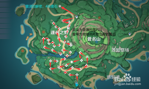 雷石全部分布在鹤观地图的左半边,下图的花朵标志全是雷石。