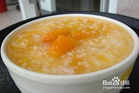 (3)玉米渣煮到半熟时,把南瓜块放入一起煮,直到南瓜熟、粥熟变稠。