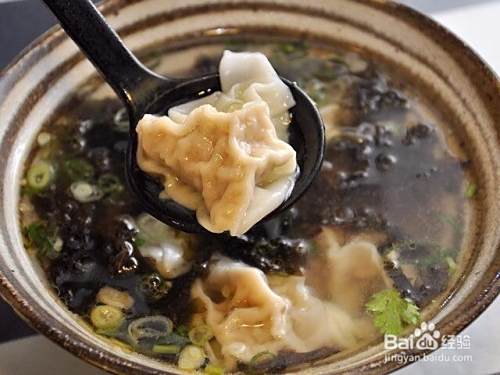 (5)用一个汤碗放入虾皮、紫菜、味精、香油、少许酱油,用刚煮好的馄饨连汤一起倒入汤碗中即可。