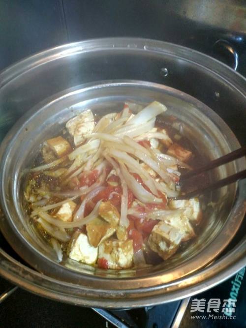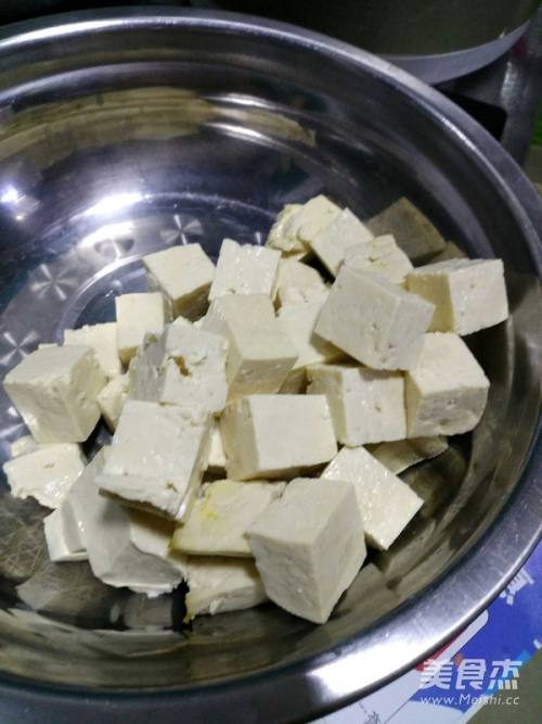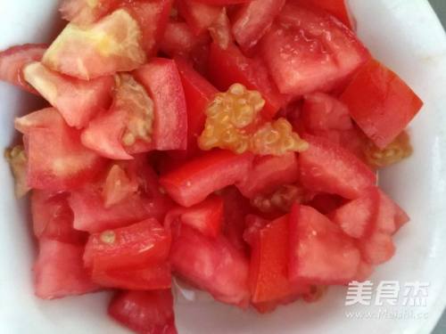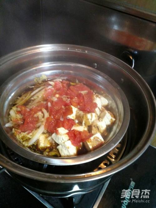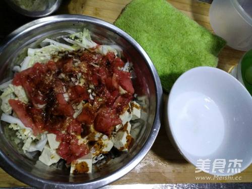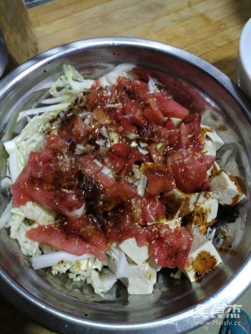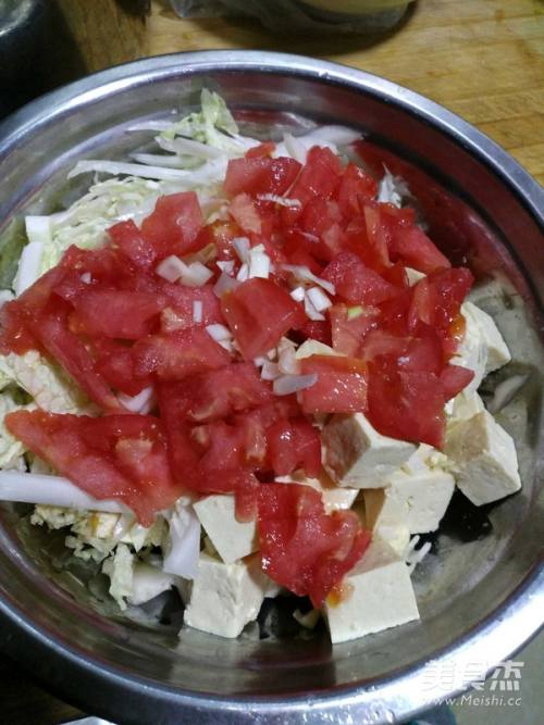 4把白菜、豆腐块、西红柿放在深一点的不锈钢小盆中,因为蒸的时候会有很多的水分