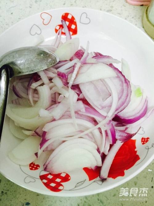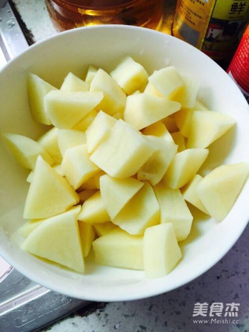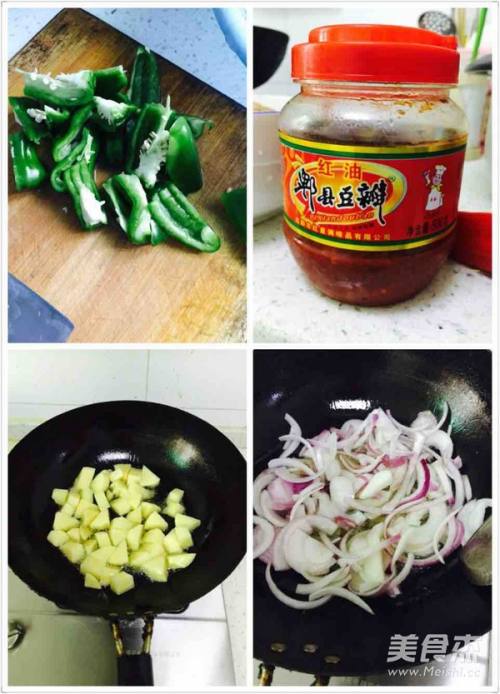 5青柿子椒洗净切块,土豆和洋葱放油锅里稍微炸一下!盛出备用!