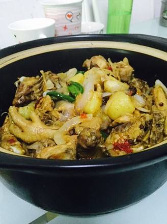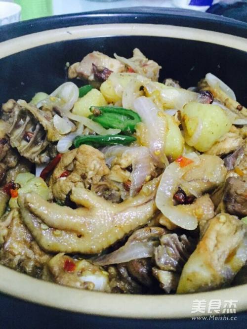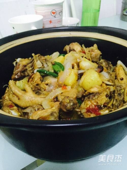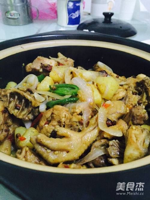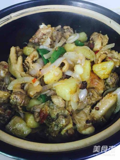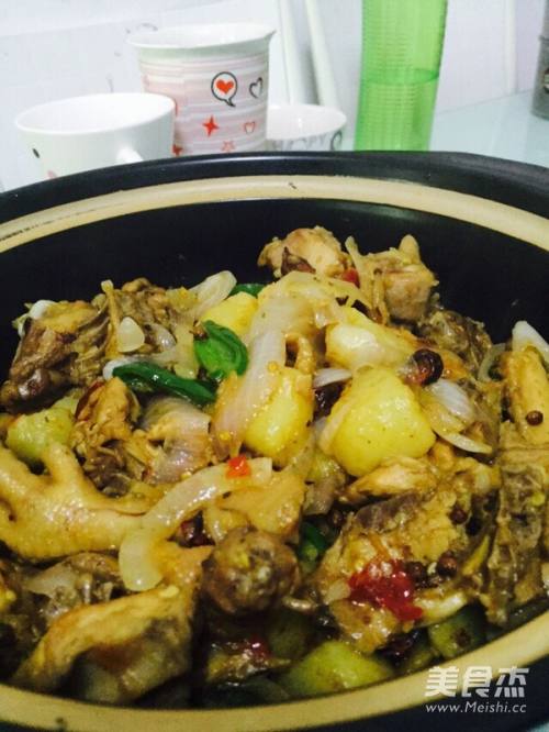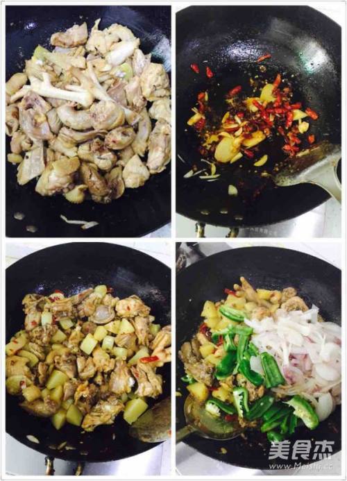6鸡肉放油锅里稍微炸一下,炒一炒盛出!把辣椒,姜蒜及花椒八角放入锅中,炒出香味!之后放入炸好的鸡肉,翻炒片刻后放入土豆块。加适量水焖煮片刻后。煮至水份变干。千万别糊!然后放入青椒和洋葱翻炒。加入适量盐,十分钟后就可以出锅了!