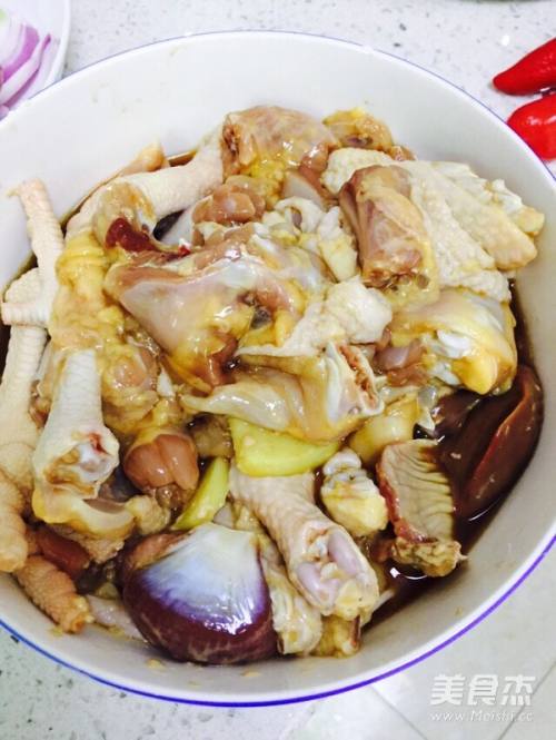 1鸡肉洗净剁成小块,并用料酒、酱油、生抽,生粉及盐腌制10分钟!