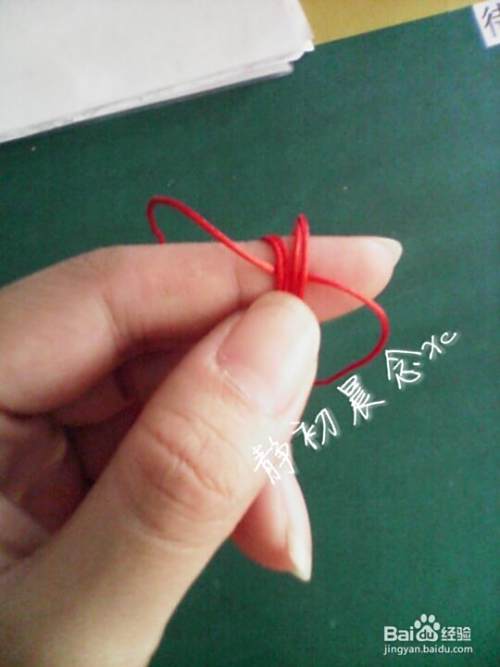 将两根红线对齐,然后对折,找到中心点处(不用很精确,大概位置就好。),然后将大拇指放在中心处
