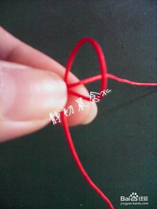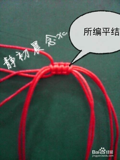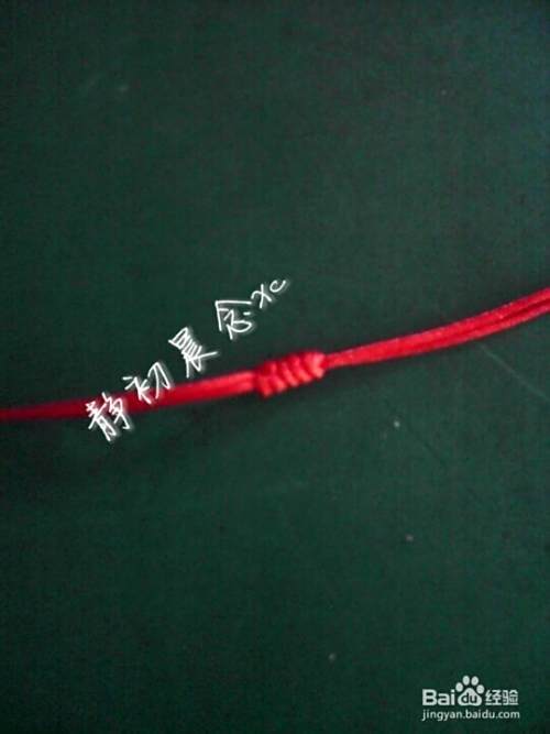 接下来,我们就开始编金刚结。至于金刚结的步骤我就不详说了,有金刚结编法的相关经验,可以参考下。编五个金刚结就可以收手了。如图所示。