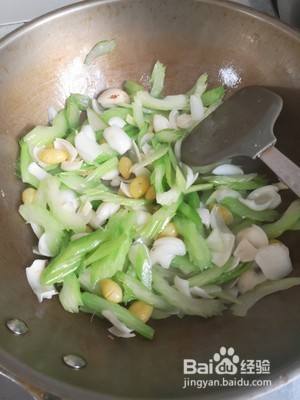 先放药芹炒两下,然后放百合白果炒,再放一点盐一点开水,因为百合很容易熟,白果已是熟的,炒制过程不超过5分钟,出锅前放点糖。