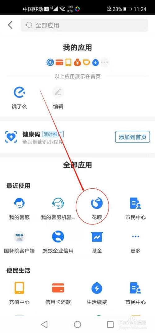 在全部应用中点击”花呗“。