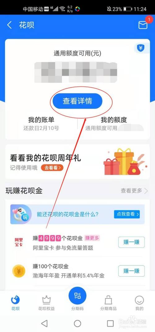 进入花呗页面点击“查看详情”。