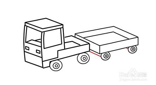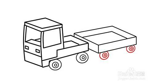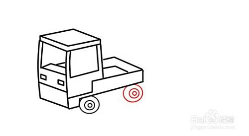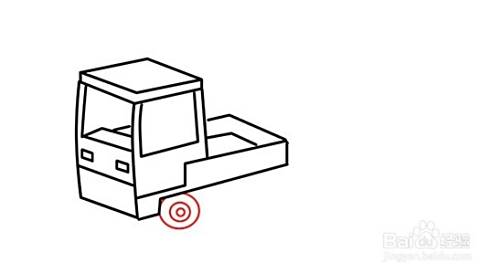 用步骤6中的方法画轮子,在后车厢下方左右分别添加上车轮。最后,用斜线往左往上画平行左边车板底线,勾画出轮子的的车轴板。