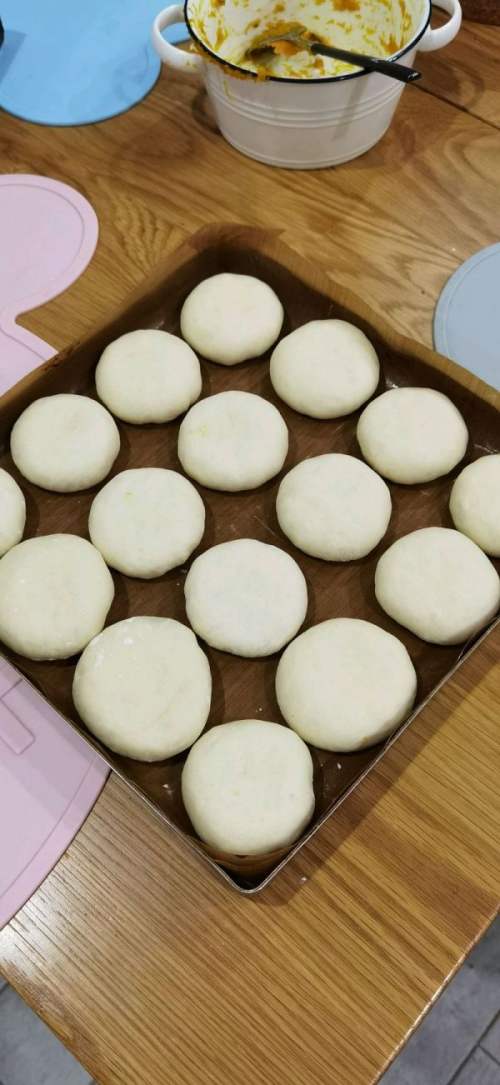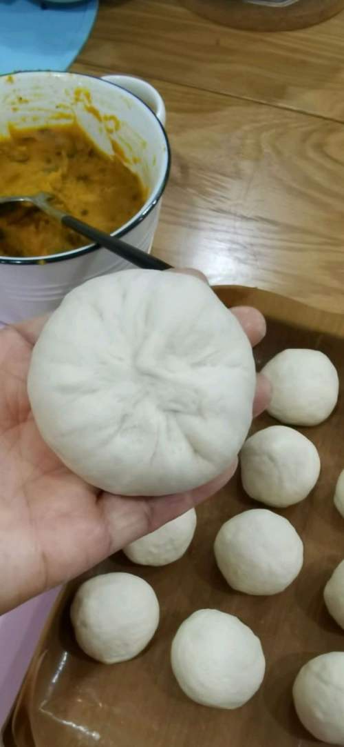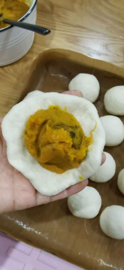 12逐个包好,内馅可多可少,我正好19个面团包完南瓜馅。