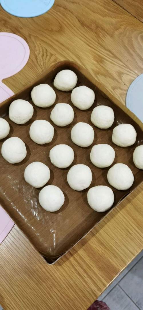 10基本上南瓜蒸好凉好,面团就发酵好了,取出排气,分成40克左右一个。