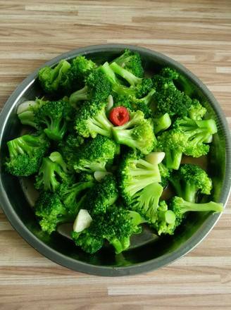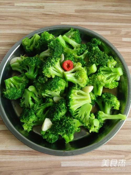 锅烧热加适量油烧至七成热放入大蒜和西兰花翻炒二分钟,然后加适量盐,鸡精,生抽,加少许水快速翻炒二分钟盛出装盘即可。