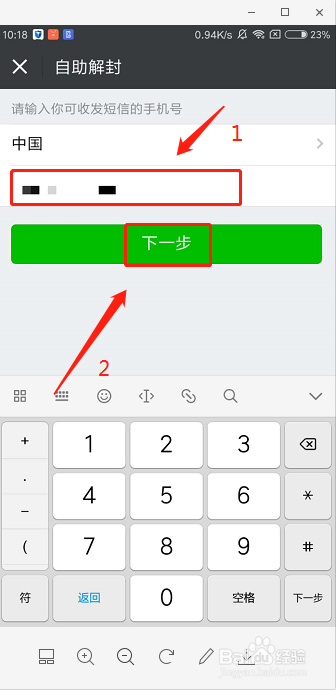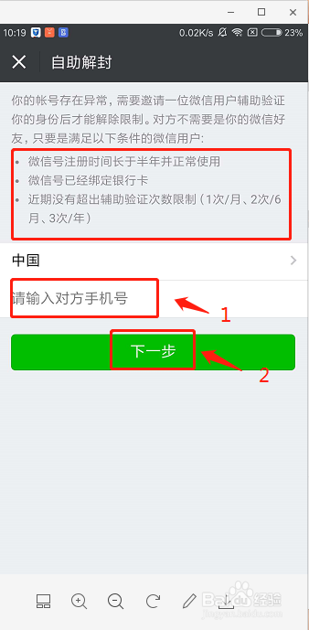 输入手机号(只要满足以下要求,非微信好友也可帮忙解封)→下一步