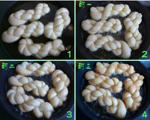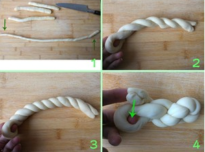 左手向前,右手向后,两手反方向搓,给面条上弦。两端合并,右手提起,面条自会相互缠绕。顺势多缠几下,再提起,麻花会自动扭转到一起,将一端塞入另一端孔内,就定型好了。