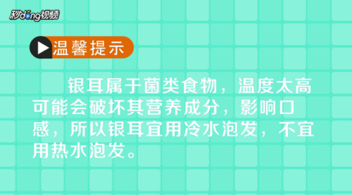 温馨提示:银耳属于菌类食物,温度太高可能会破坏其营养成分,影响口感,所以银耳宜用冷水泡发,不宜用热水泡发。