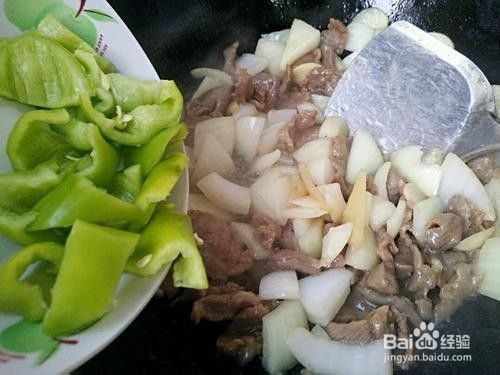 接着放入青椒翻炒均匀