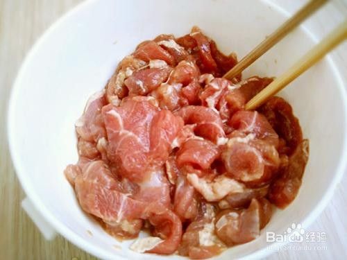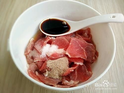 将羊肉洗净切薄片放入碗中同时加入1勺料酒 2勺生抽 适量的胡椒粉和适量的盐搅拌均匀