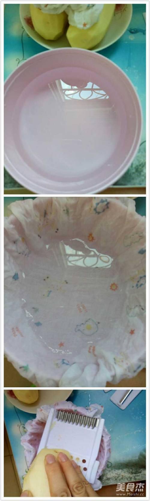 2碗里加入清水,把沙布遮碗上 ,消好皮的土豆用厨房多功能刀磨泥器磨碎