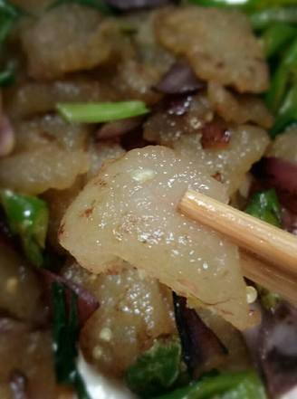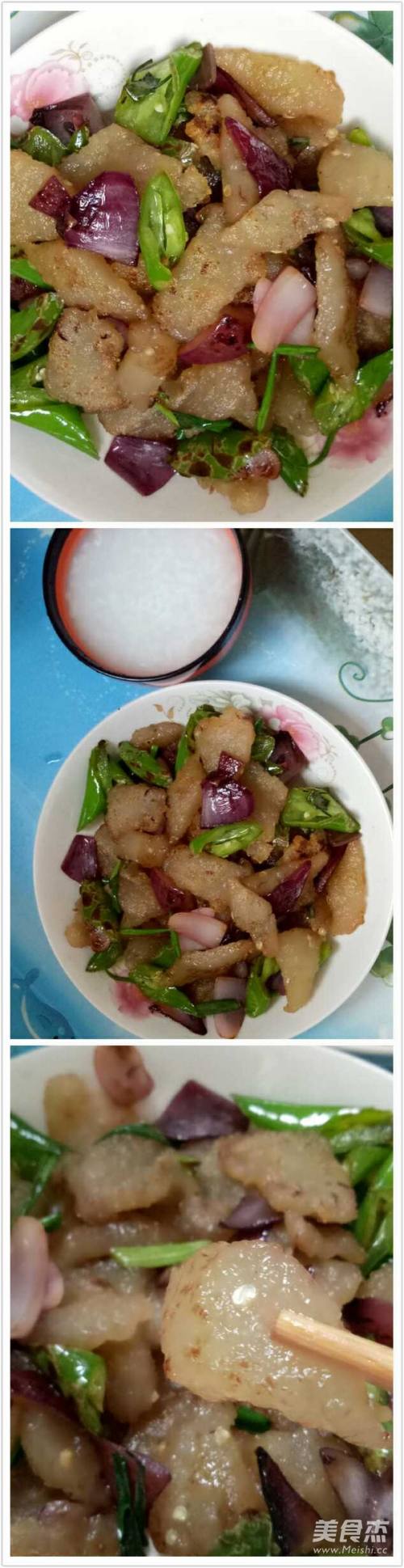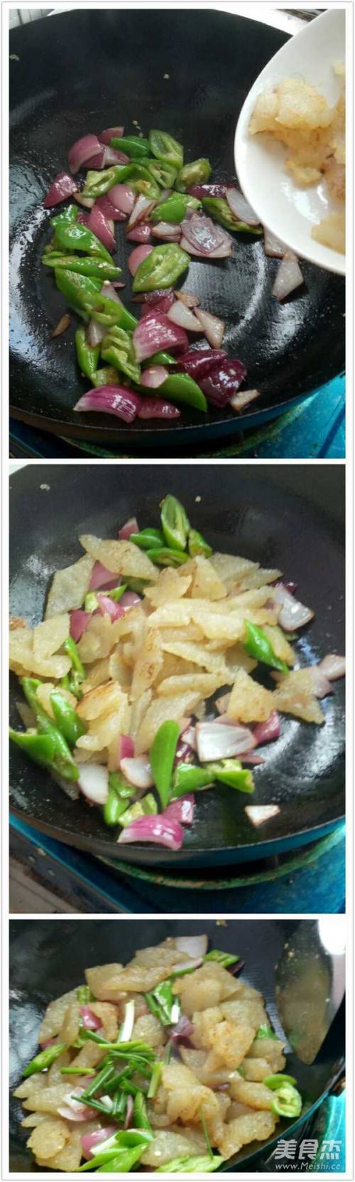 10洋葱香味炒出后,将切好的水晶土豆倒入 炒三十秒,根据咸淡而添加盐,加入少许鸡精与葱段炒均匀就能起锅了