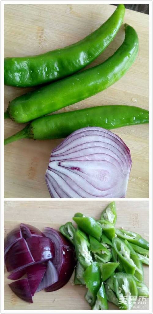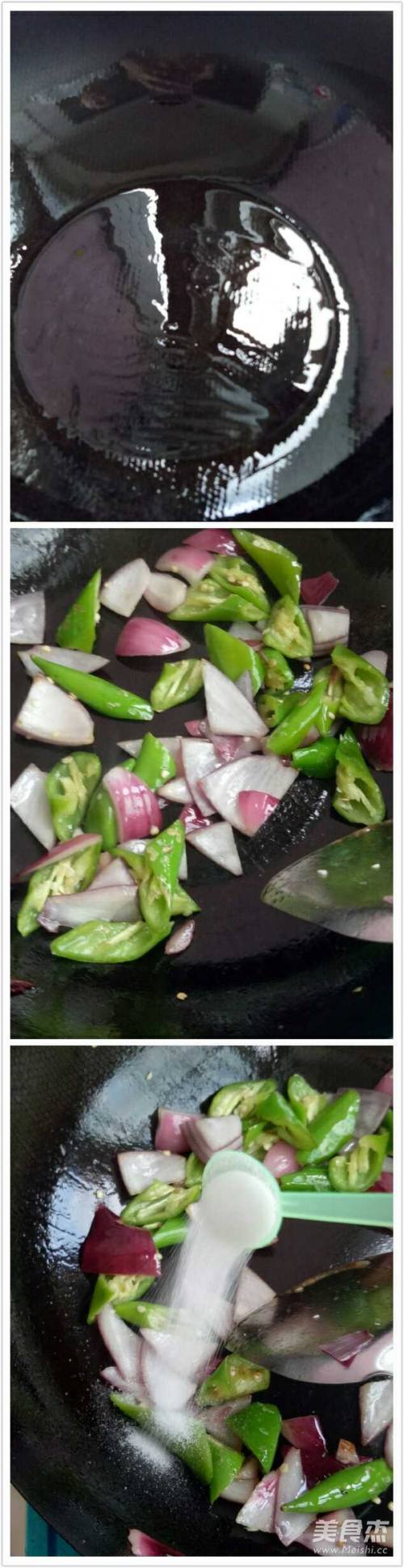 9锅里加少许清油,大火,倒入洋葱与青椒,翻炒加入少许盐后炒十来秒