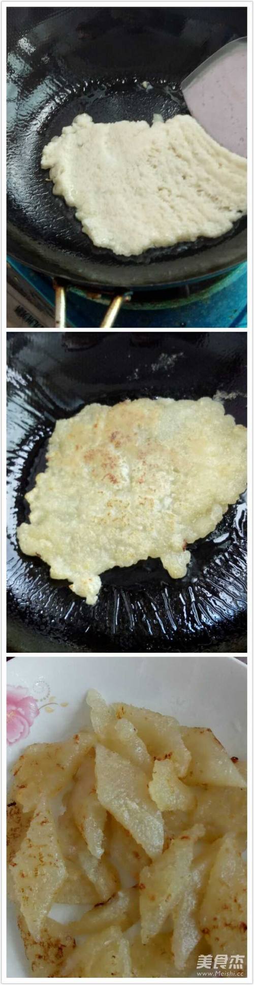 8如果有不粘锅或者韩国烤锅效果将更好!中火,油布满整口锅后,倒入一部分土豆泥,用锅铲把土豆泥压散开,煎至两面微黄(根据各人的口味而煎,金黄色深点更老点)用刀切成小块