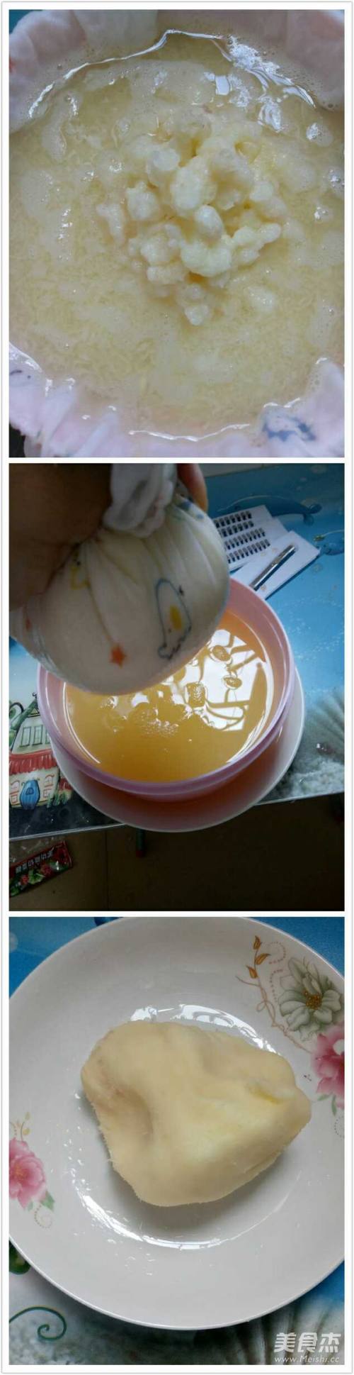 3两土豆磨完后,抓住沙布把土豆泥中的水稍微挤一挤,把土豆泥装盘子头,重点是那个洗土豆泥的水,静待十至二十分钟
