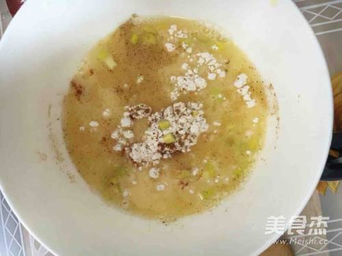 2鸡蛋,清水。以上调料,葱花,料酒,少许面粉。搅拌均匀。