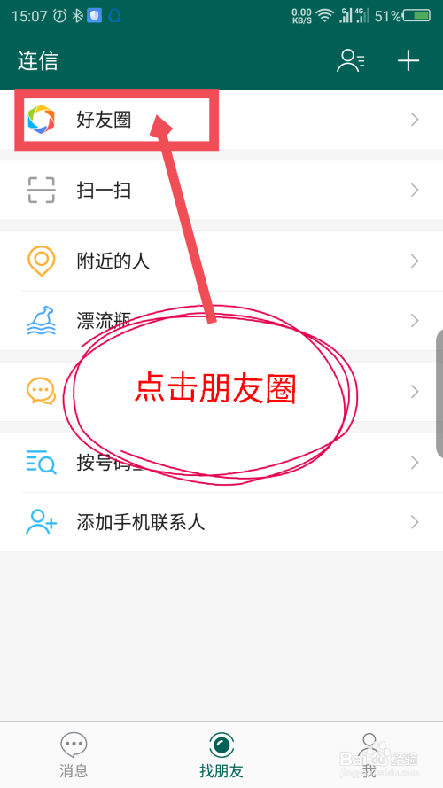 打开找朋友界面后,点击本界面最上面的朋友圈选项。如图所示