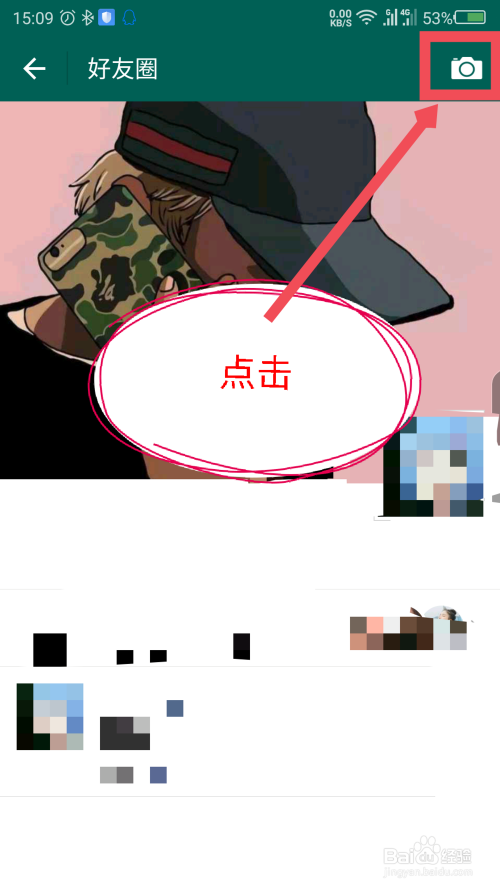 打开朋友圈后,是不是很熟悉,和微信一样。点击右上角的相机图标。如图所示