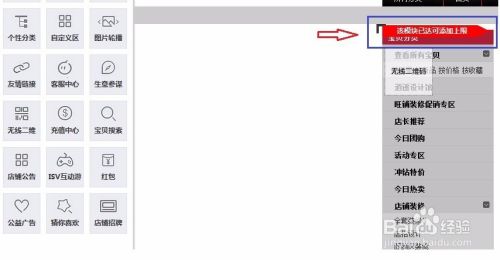 添加模块,系统默认的模块有很多,常用的有 宝贝推荐、宝贝排行榜、默认分类、个性分类、自定义区、图片轮播、友情链接、宝贝搜索、店铺招牌。