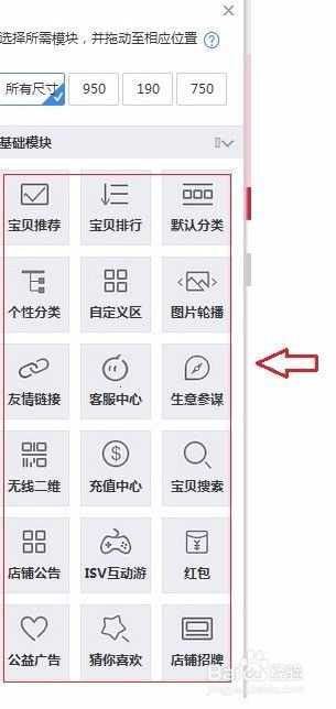 模块有分950PX、750PX、550PX、190PX,对应专业版本的店铺有950PX和550PX,基础版的店铺只有190PX,因此你的店铺如果是专业版本的所有尺寸的模块都可以添加;基础版的只有750PX和190PX的模块,招牌都是统一是950PX的。