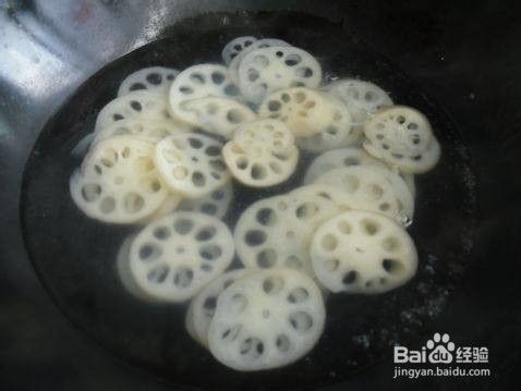锅里倒入适量的水起火,将藕片放入沸水中烫1分钟捞出沥干水分。