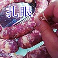 有空气的地方,肉馅下不去,可以用牙签扎个小洞放气。每隔十厘米左右扭一下,以后吃的时候从此处切断即可,最后将头上打结。