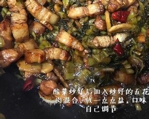 炒好的五花肉剩出,然后把酸菜用油煸炒,这部也可以放在最开头的,先把酸菜炒好再炒五花肉。酸菜炒好后放入五花肉,这时可以调入一点的盐。