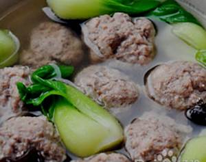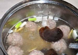 再开锅后,转小火,打入一个鸡蛋液。加入木耳。等肉丸完浮起来就熟了,加鸡精,再加入油菜。点缀下更美观。