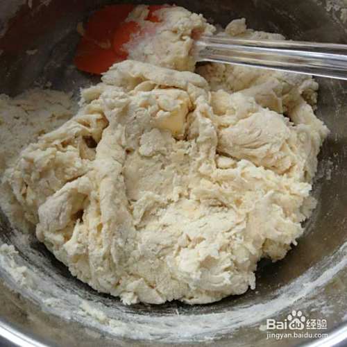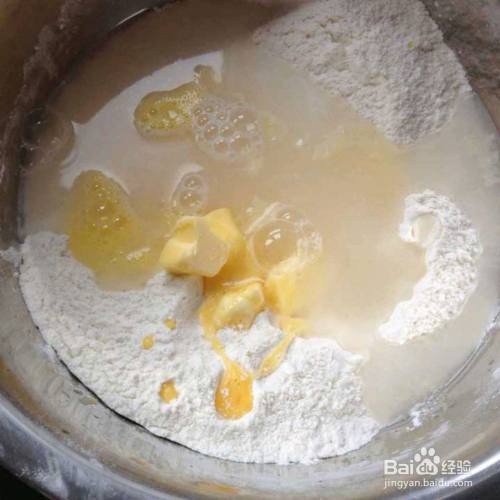 黄油切小块室温软化,然后和水,蛋液一起加入拌好的粉类。