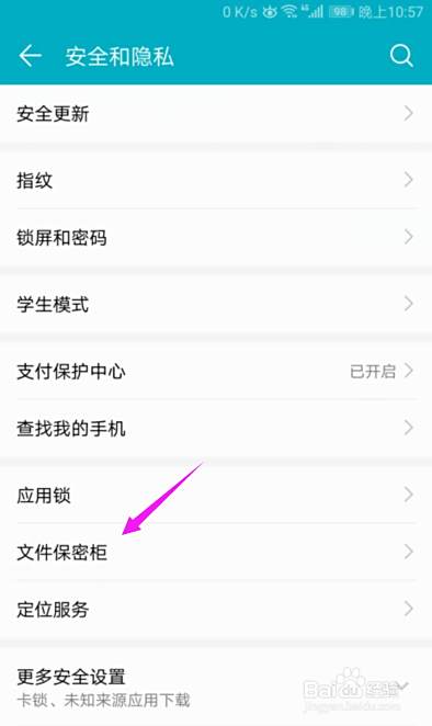 【安全和隐私】小主页面里,触摸开【文件保密柜】,如图。